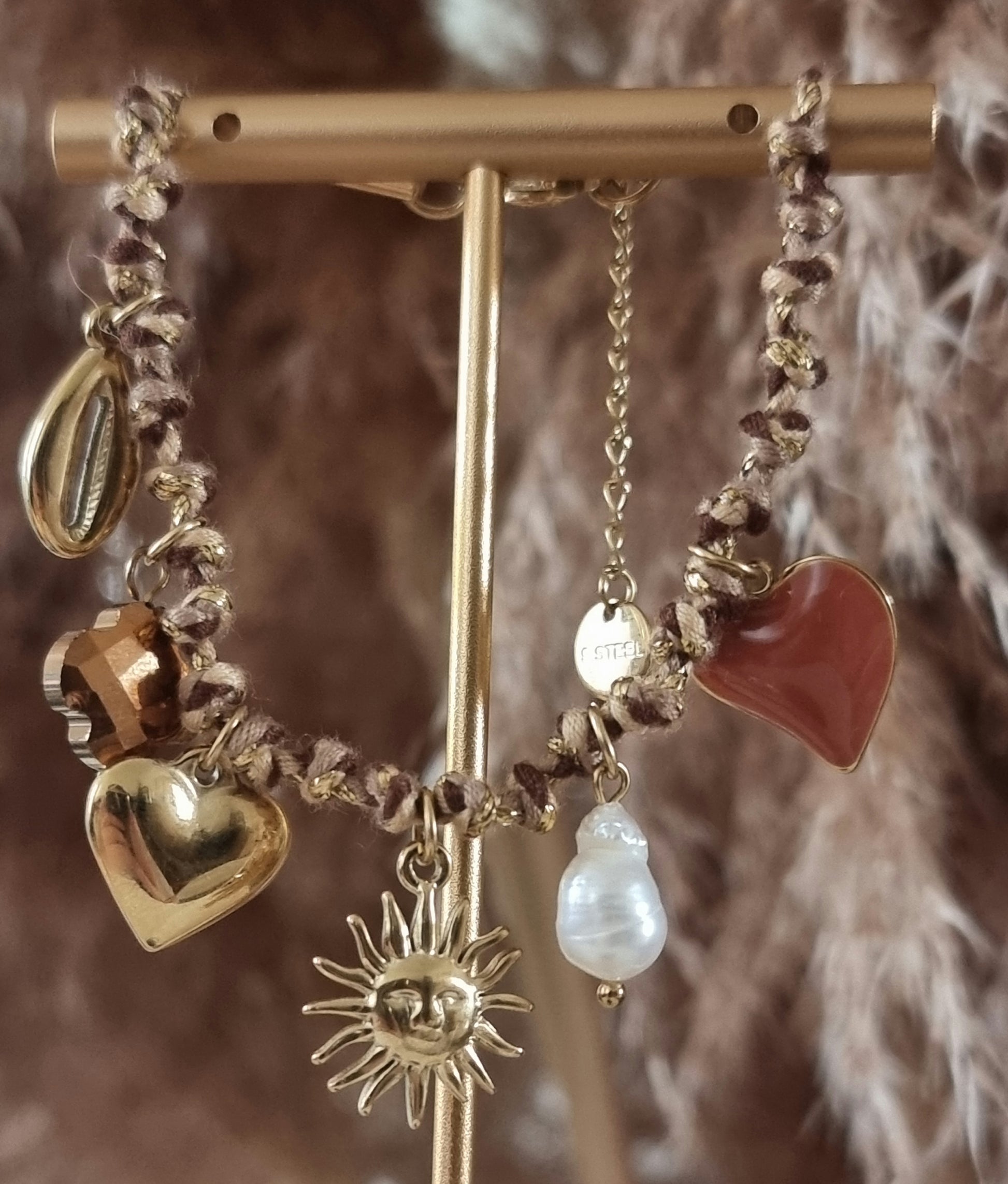 Bracelet Nalaya son cordon coloré tressé, fils métallisés, breloques avec : soleil avec visage, cœur émaillé, perle d'eau blanche, coquillage doré, trèfle en verre.