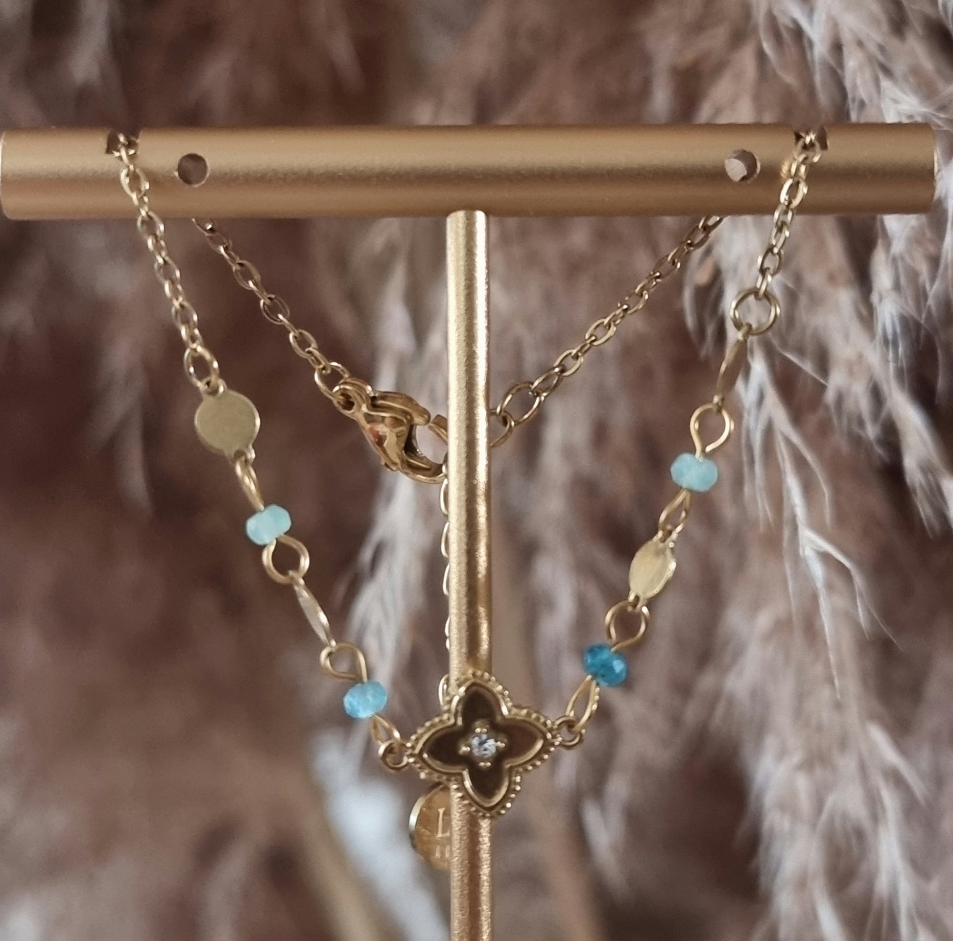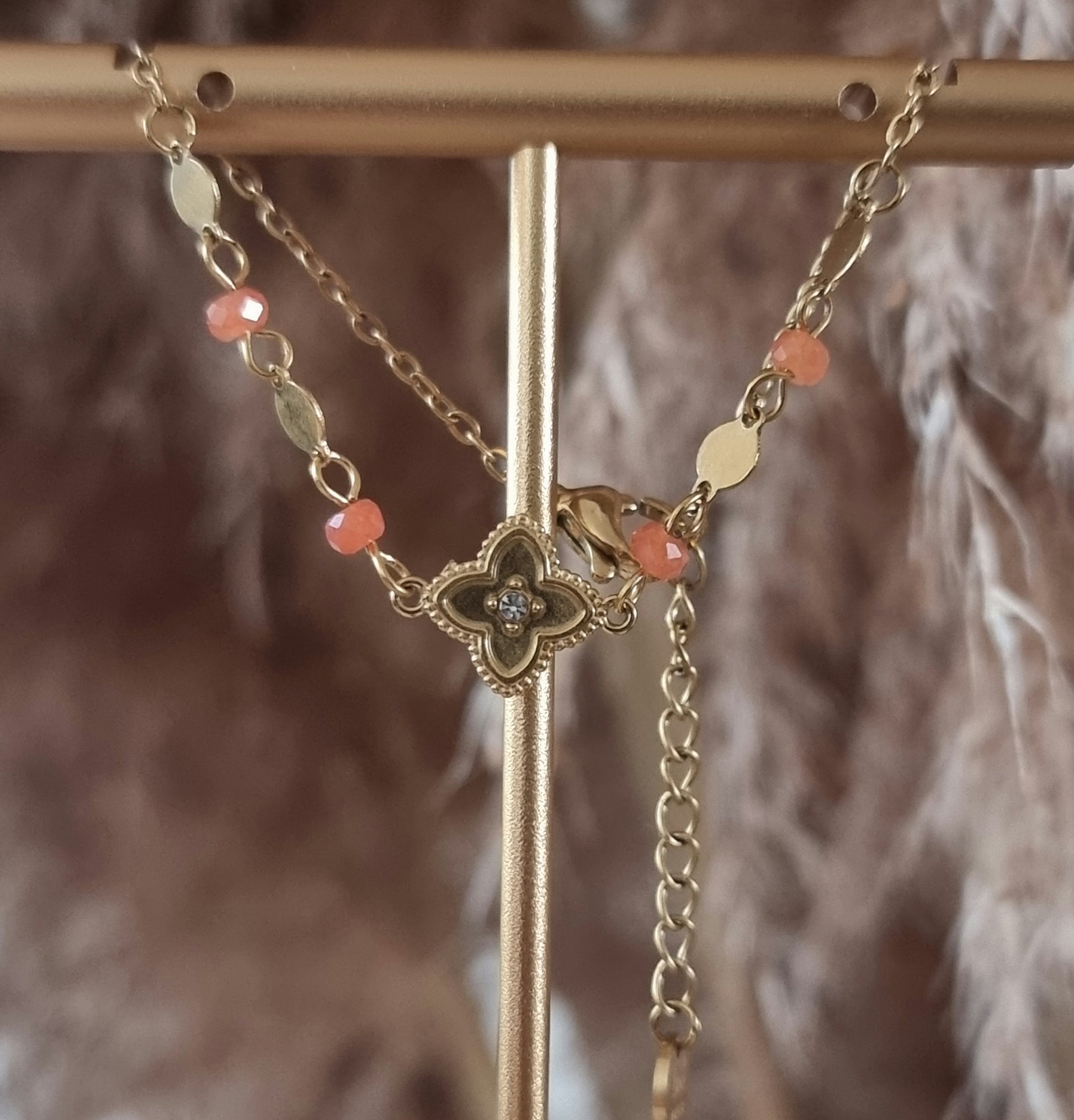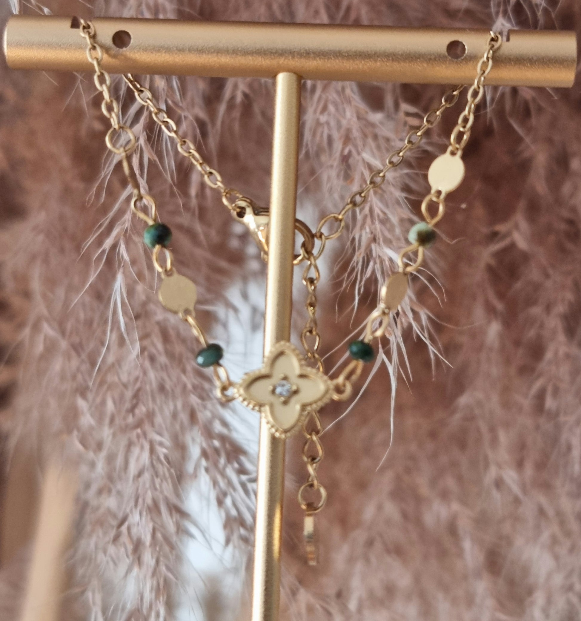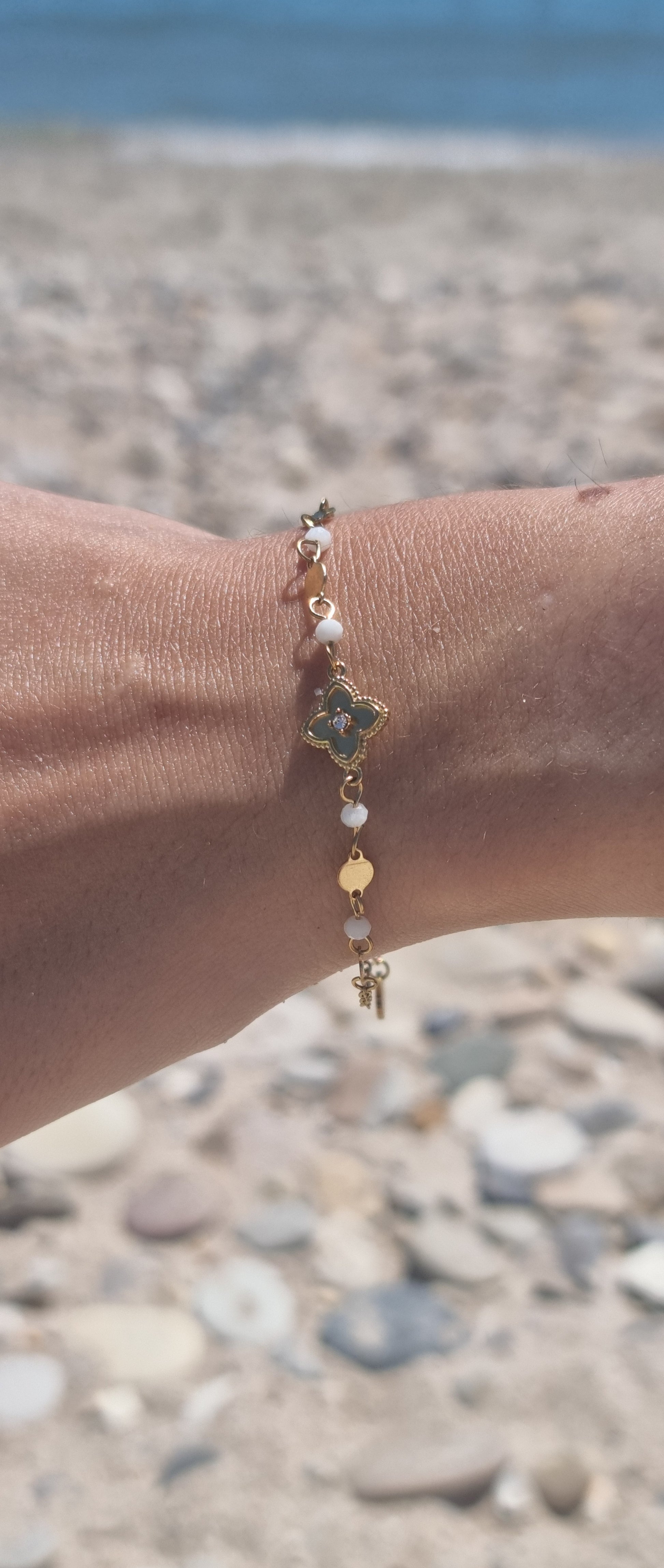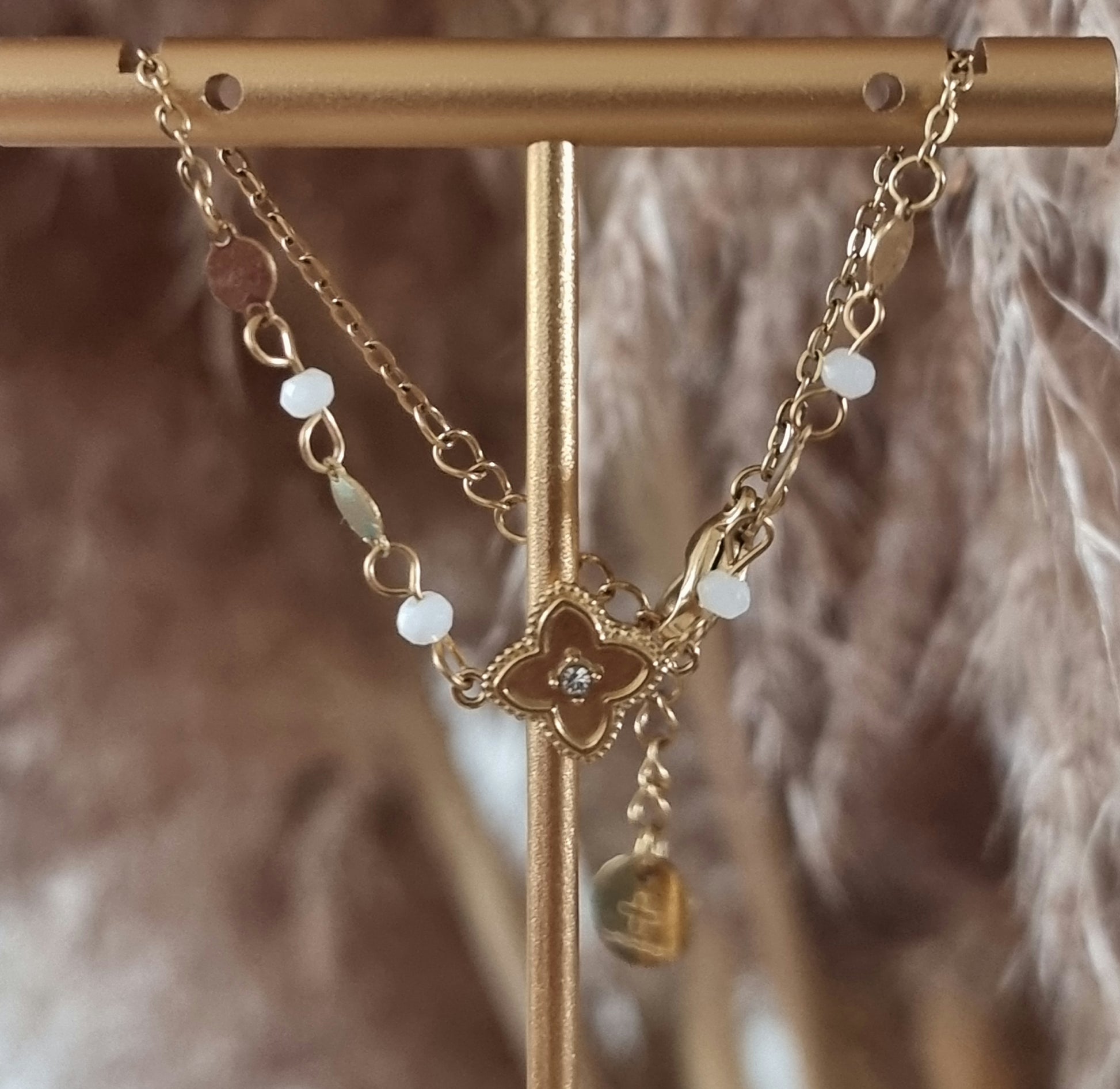 Bracelet Soreya avec sa chaîne ornée de trèfle d'un strass central, accompagné de perles naturelles et des maillons dorés, des pierres.