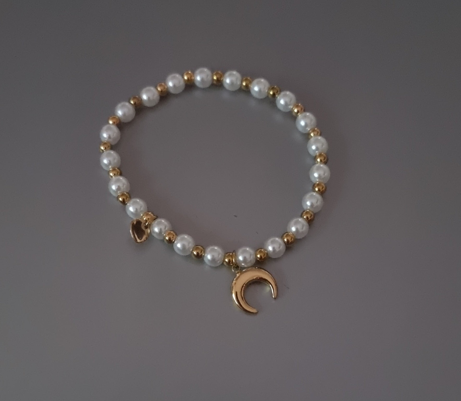 Bracelet Luna élastique en perles blanches et dorées avec pendentif lune.
