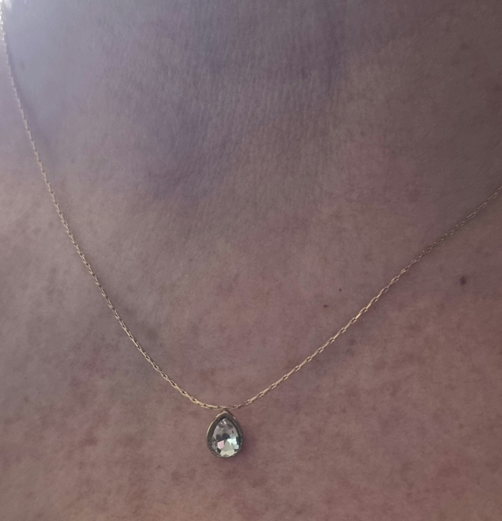 Collier court avec chaîne fine en acier inoxydable et pendentif cristal coloré blanc en forme de goutte.