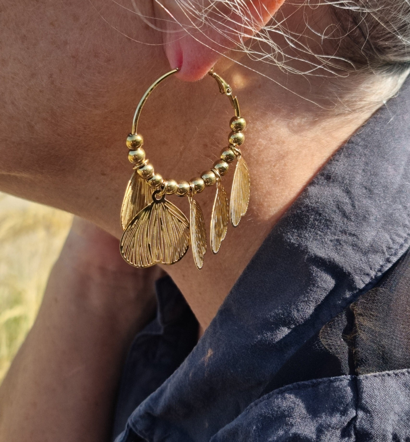 Boucles d'oreilles créoles Papyrus dorées avec des pendentifs en forme de feuilles.