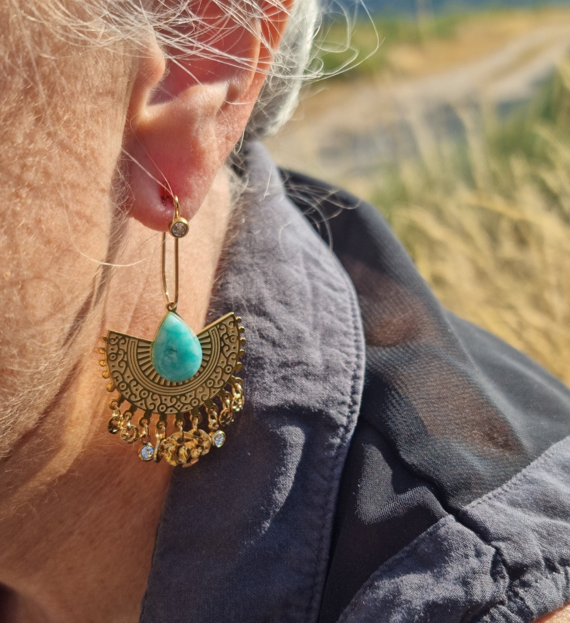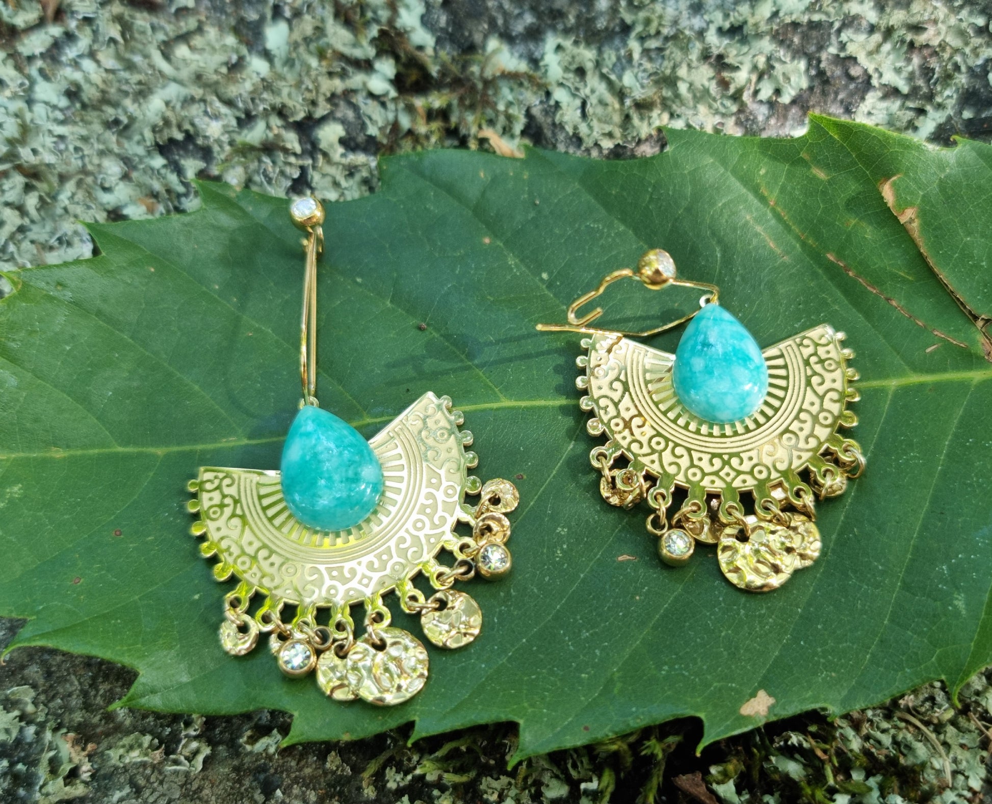 Boucles d'oreilles Bonheur dorées pendantes avec une pierre bleue et des strass.