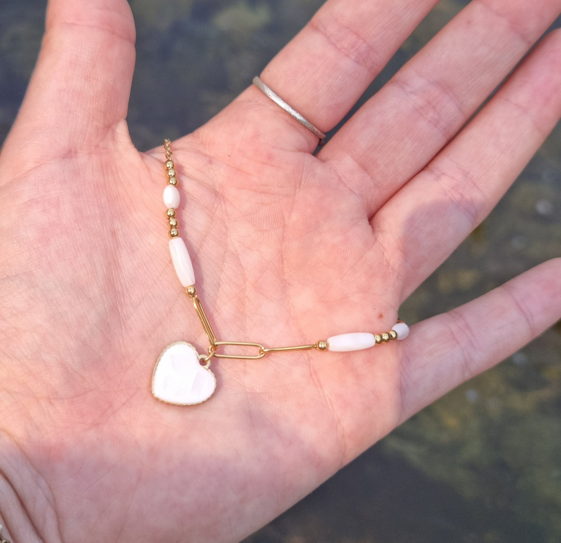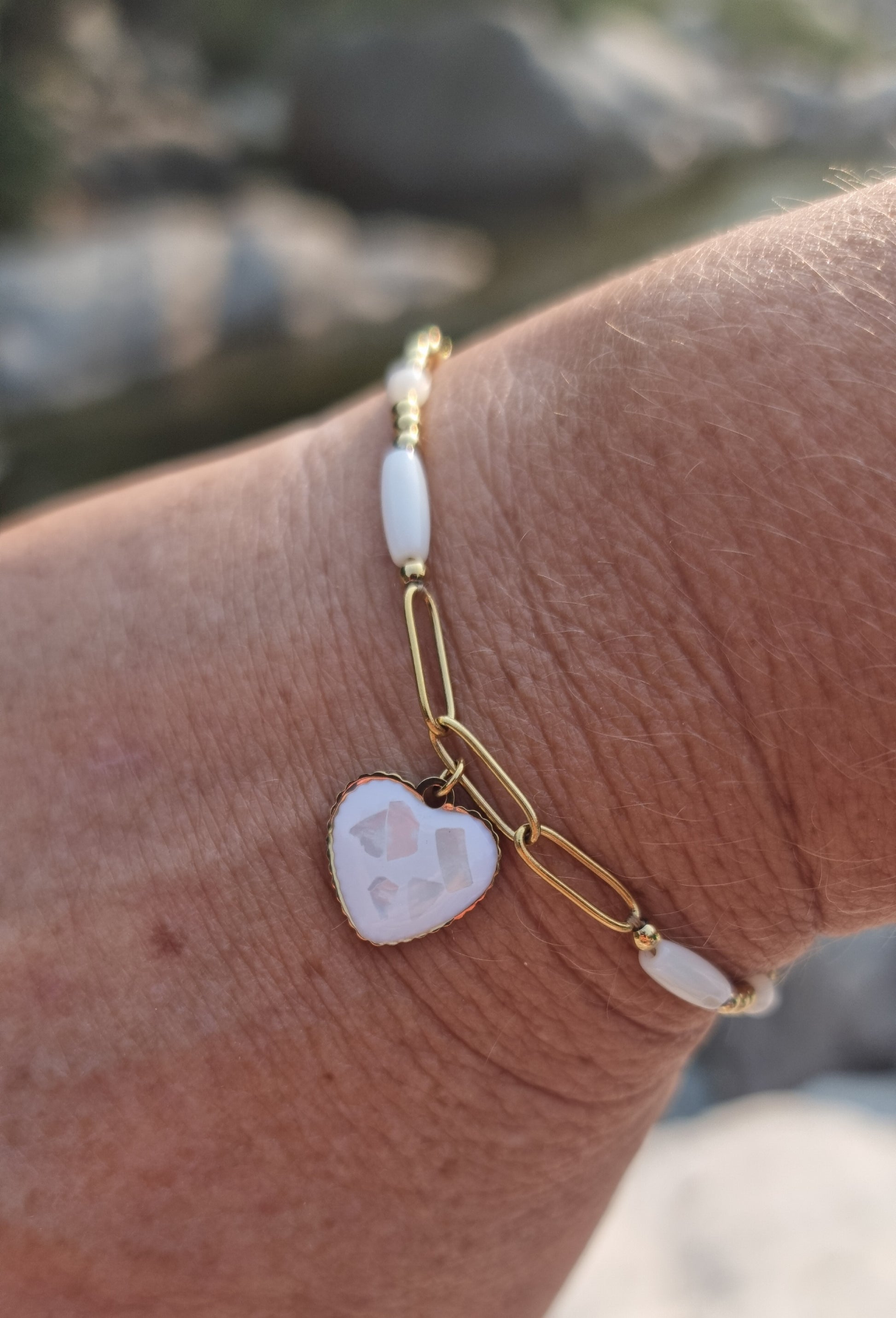 Bracelet Ange en chaîne dorée agrémenté d'un médaillon en forme de cœur en nacre blanche.