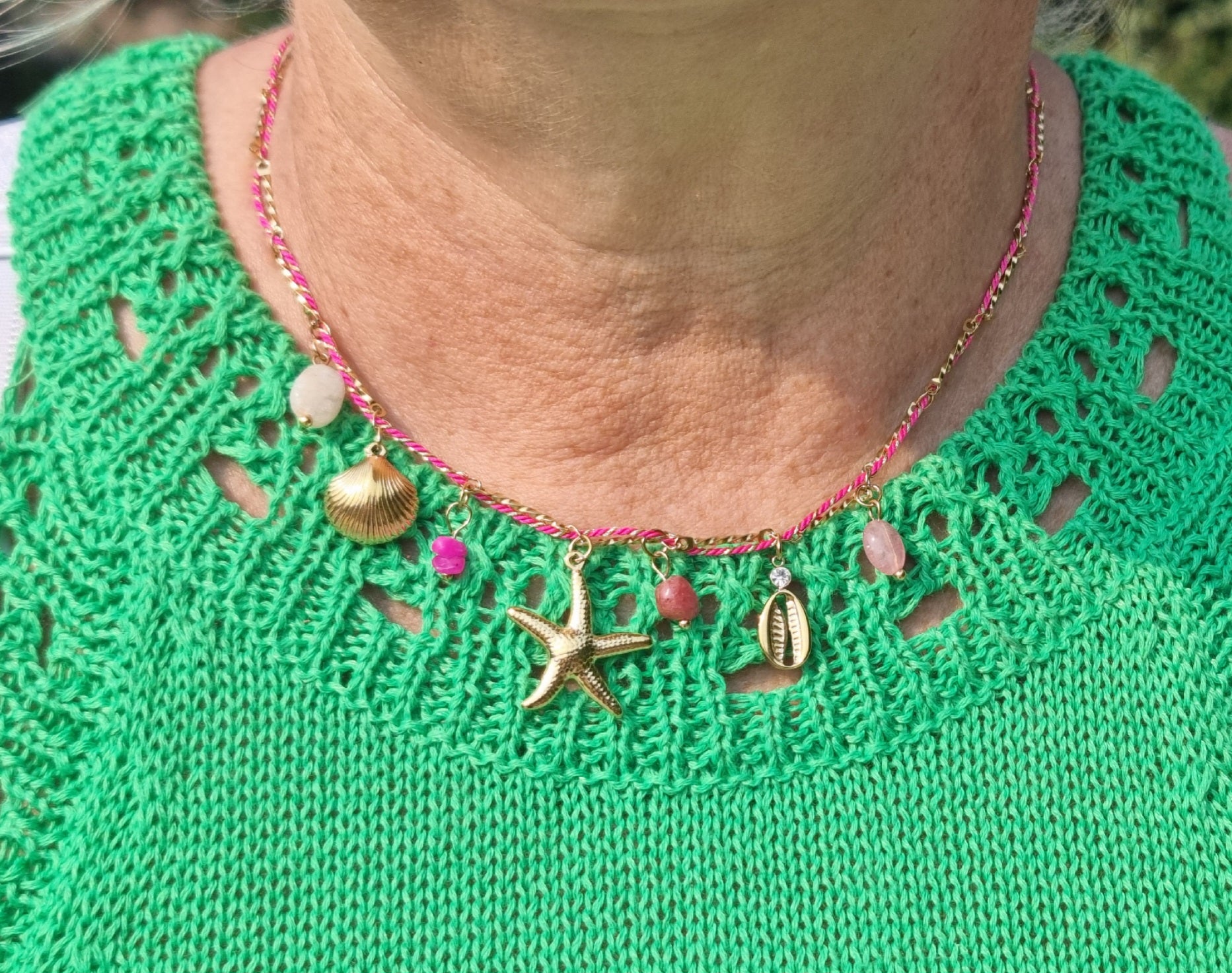 Collier Coque en chaîne dorée avec cordon rose, orné de charms en forme d'étoile de mer et de pierres roses.