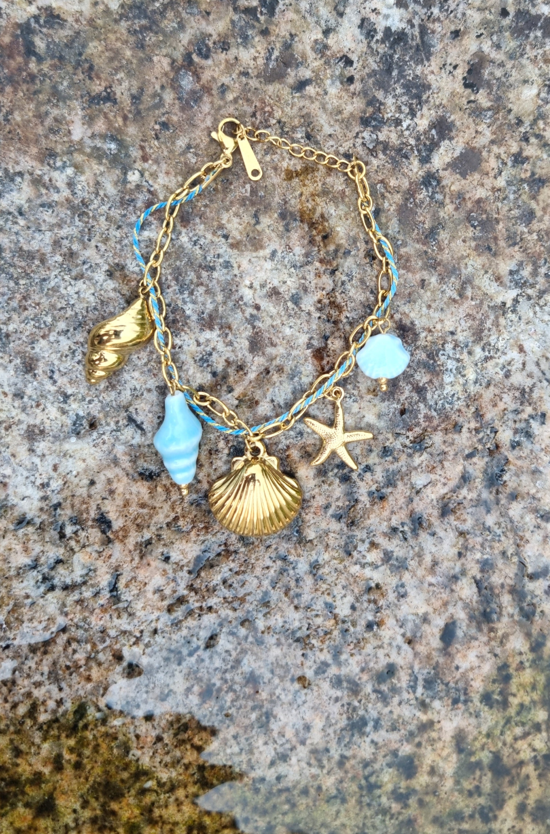 Bracelet Lagoon avec une chaîne dorée, un cordon bleu ciel et de jolis charms en forme de coquillages bleus.
