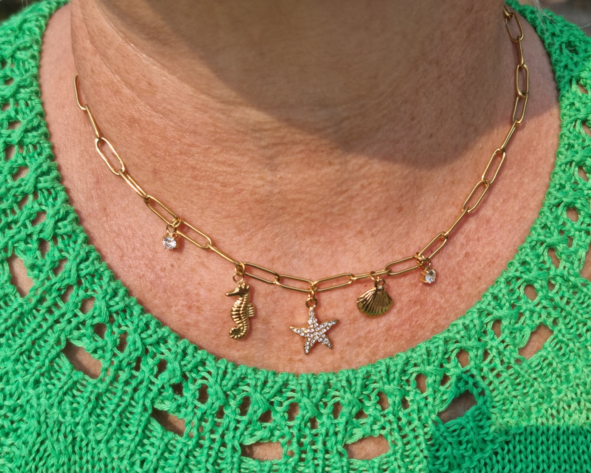 Le collier Coralia en maillons dorés, agrémenté de strass, de coquillages, d'une étoile de mer et d'un hippocampe.